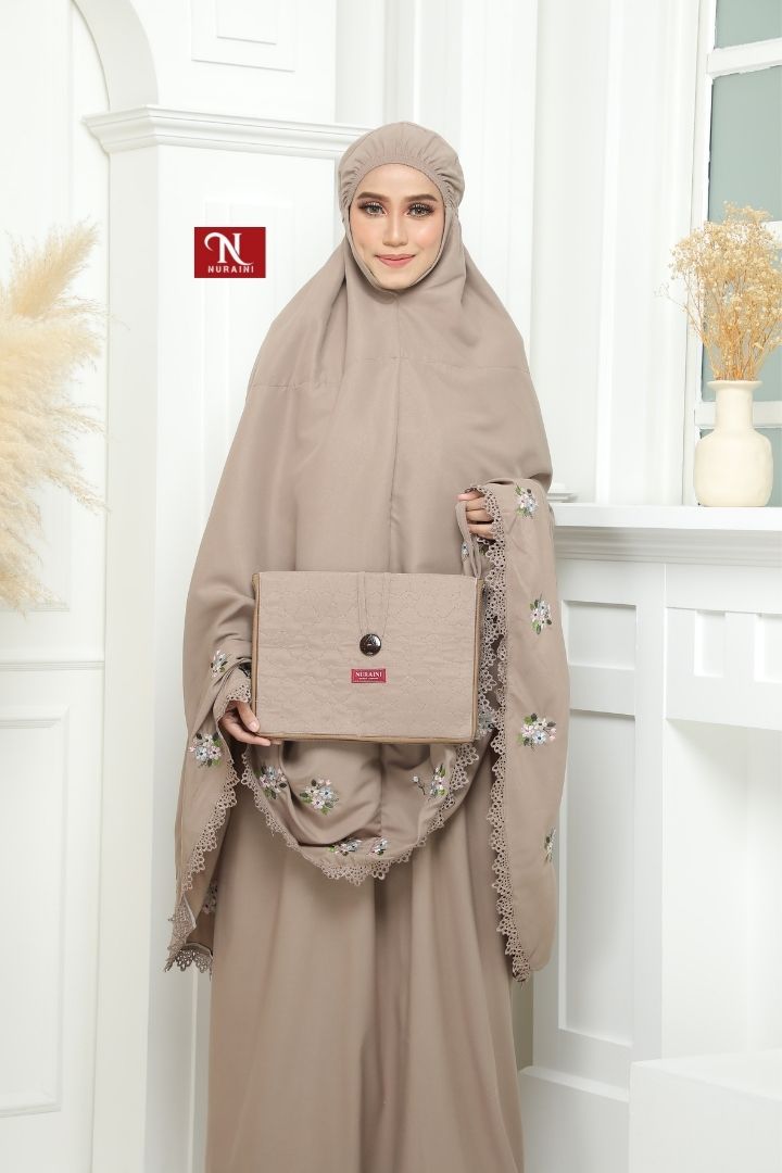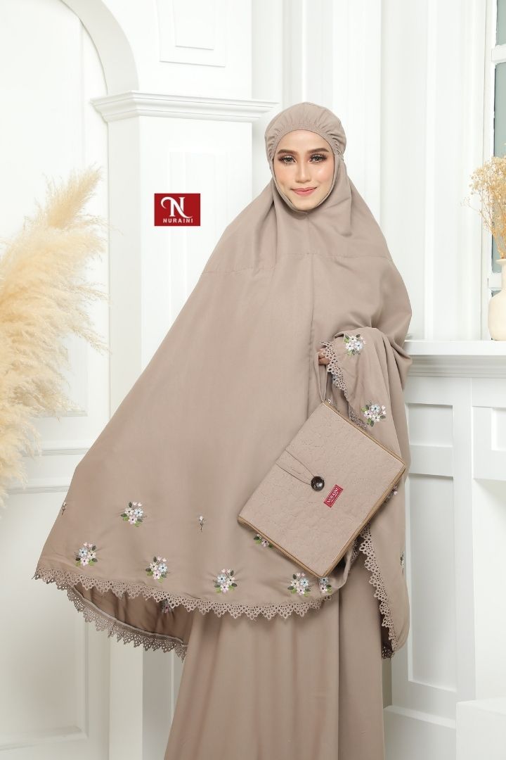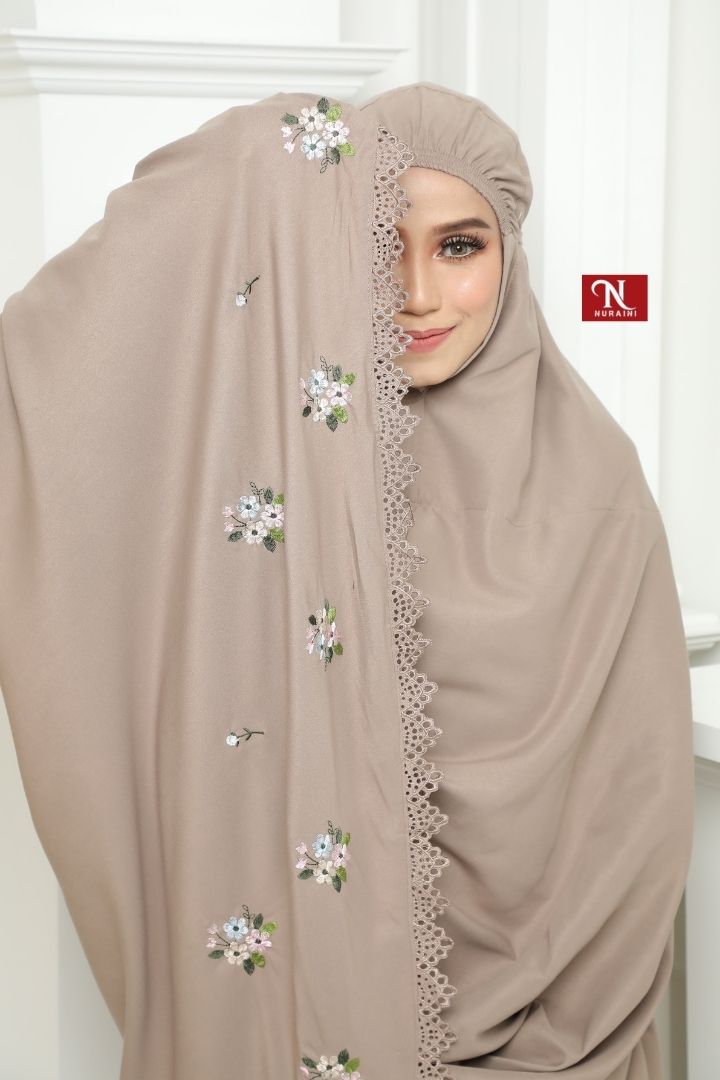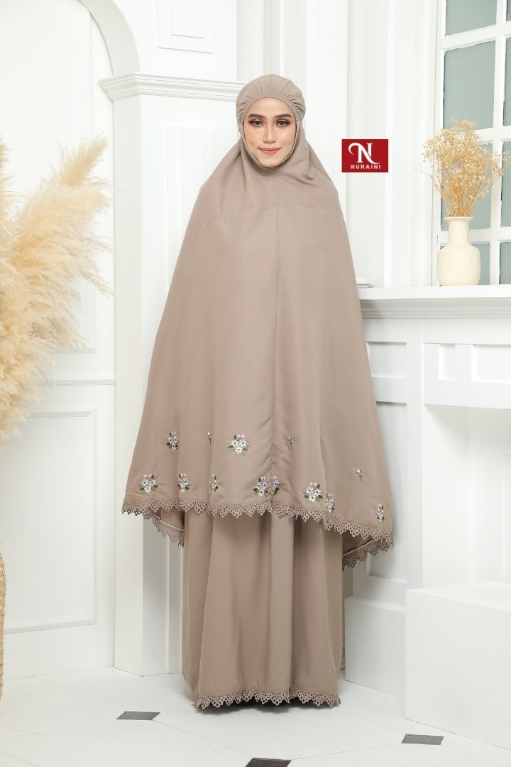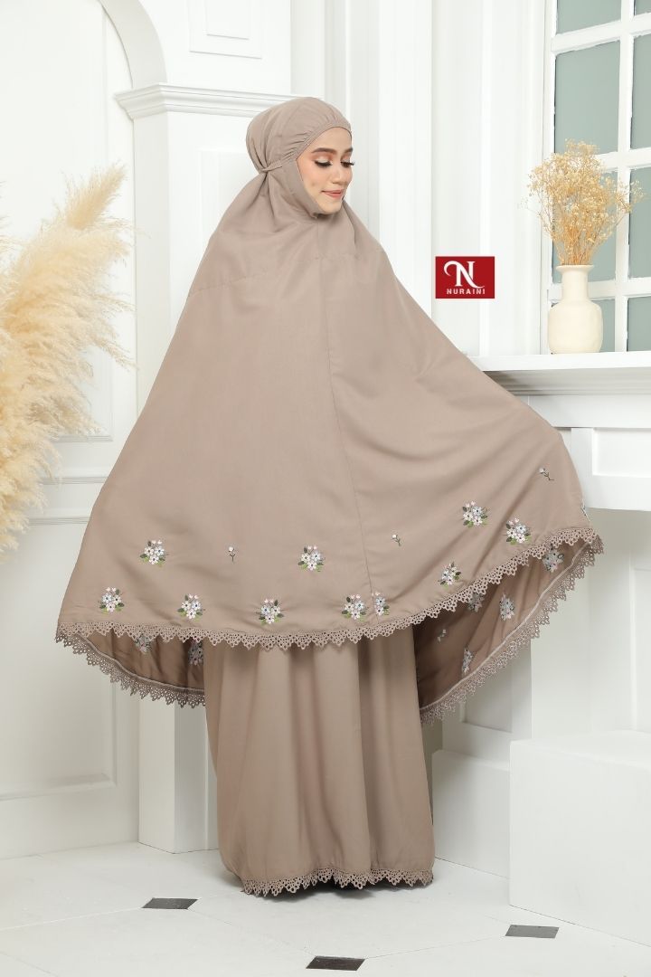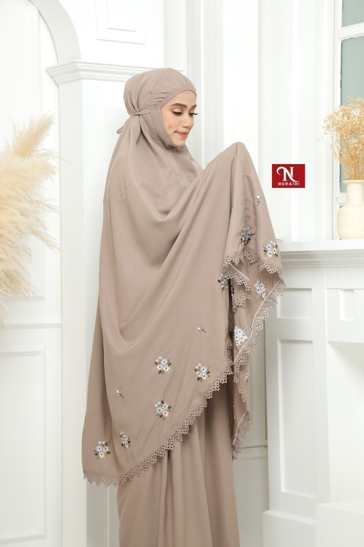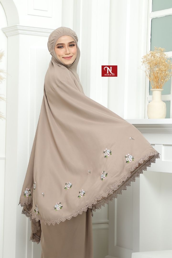 • Dihiasi dengan sulaman bermotifkan floral yang cantik disekeliling telekung.
